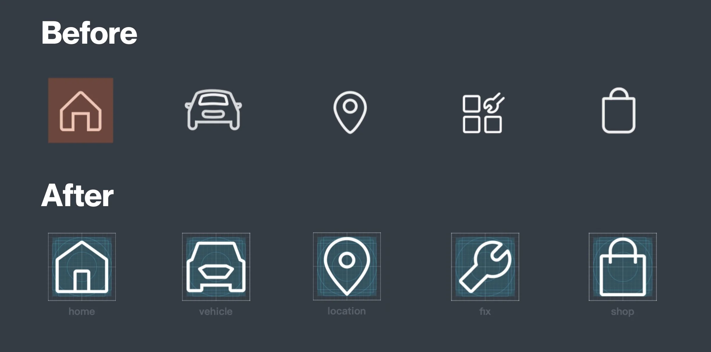 We used a new grid in the design to ensure that every icon is visually the same size.